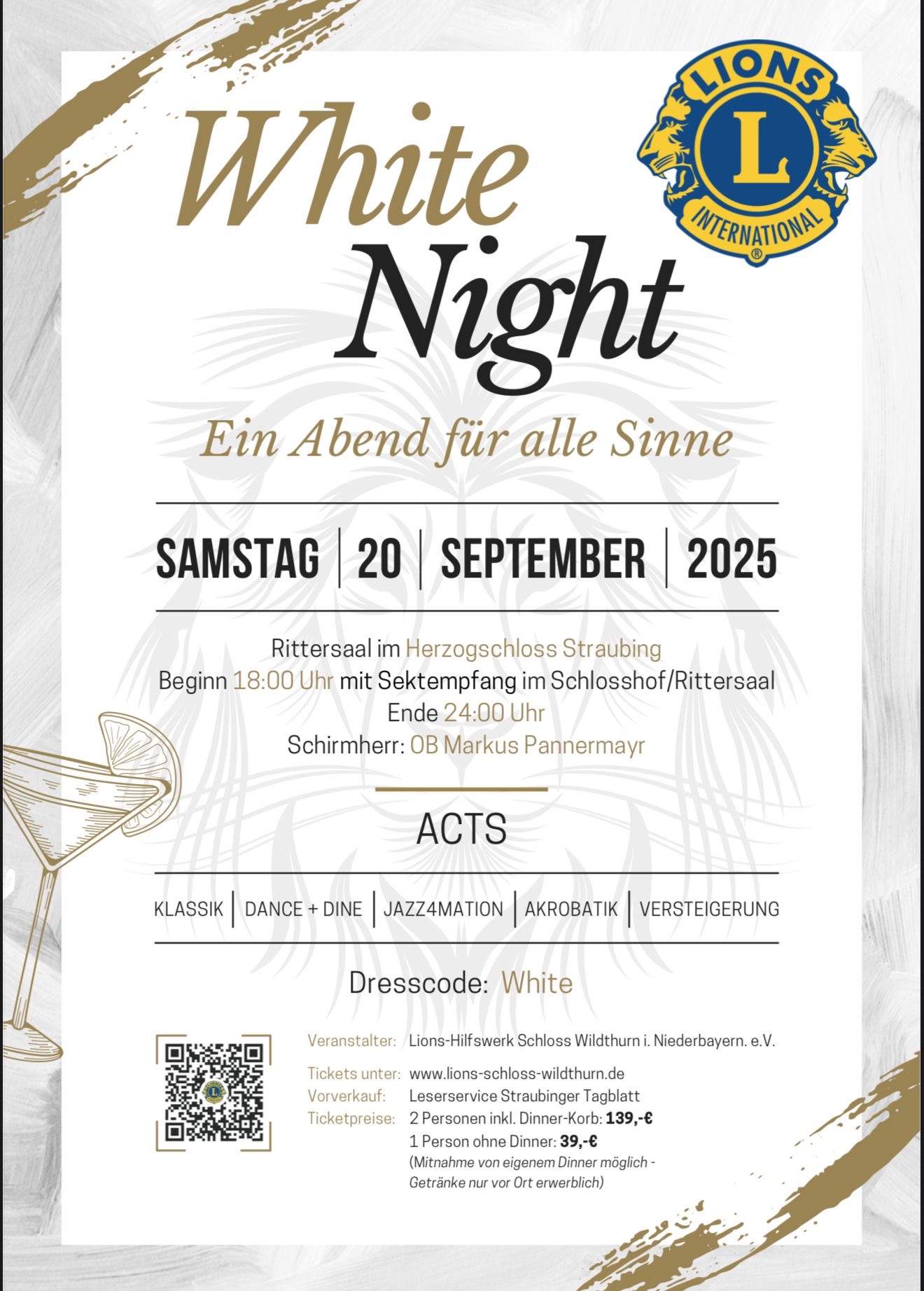 Sichern Sie sich gleich Ihre Tickets und seien Sie dabei bei der ersten White Night im Herzogschloss! https://lions-schloss-wildthurn.ticket.io Ganz unter dem Motto: Feiern. Genießen. Gutes tun.